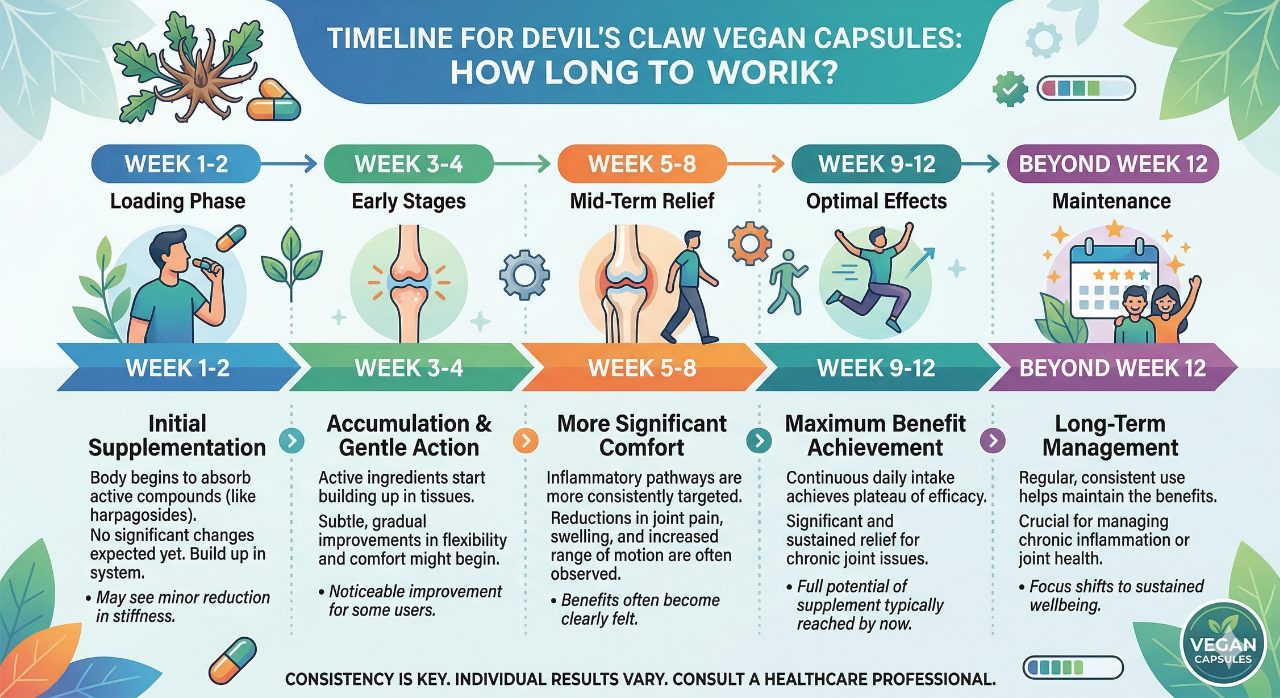 Devils claw requires consistent daily dosing for 4–12 weeks before its full anti-inflammatory benefit is established. The timeline varies by condition — acute back pain tends to respond faster, while osteoarthritis requires longer. The key variables are consistency of daily supplementation and adequate harpagoside dose. Setting realistic expectations from the outset — and tracking symptoms week by week rather than day by day — is the most effective approach to assessing whether devils claw is working for you.