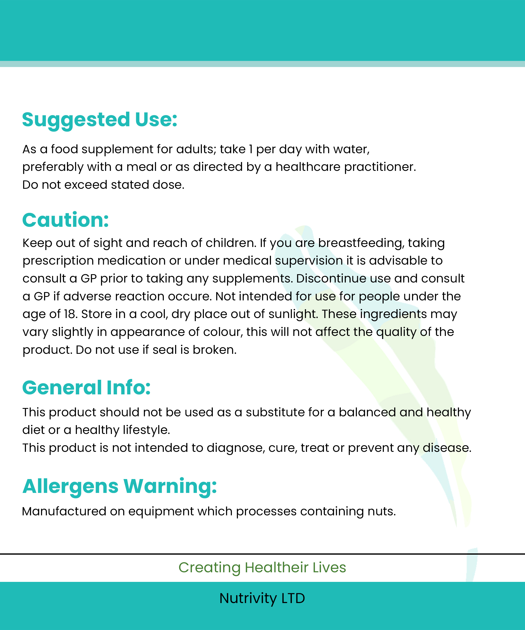 Suggested Use: Take one capsule daily with water, or as directed by a healthcare professional.