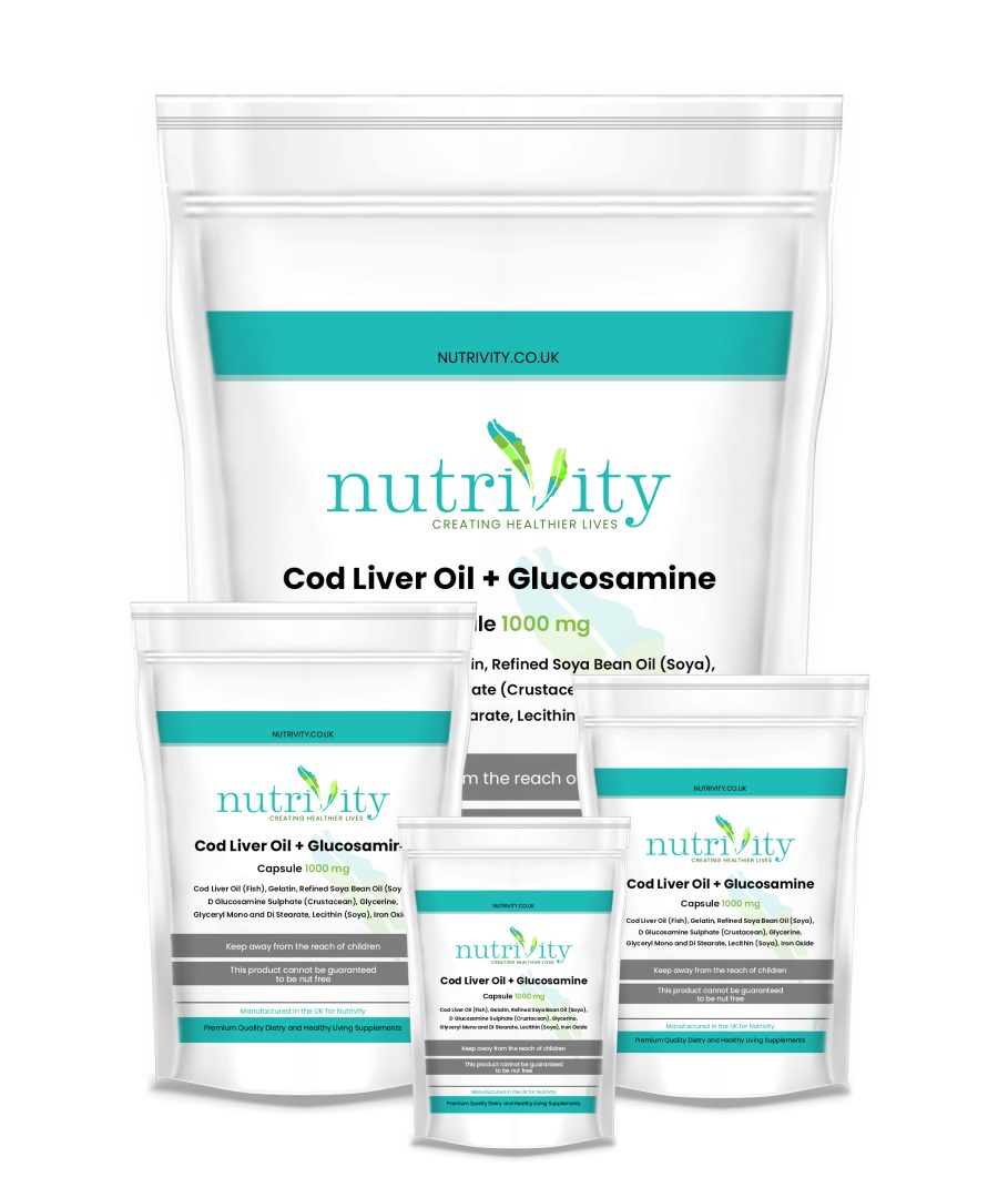 Introducing our Cod Liver oil and Glucosamine 1000mg Soft Gel Capsules. Each softgel contains cod liver oil (a natural source of omega‑3 fatty acids and vitamins A and D) and glucosamine sulphate.