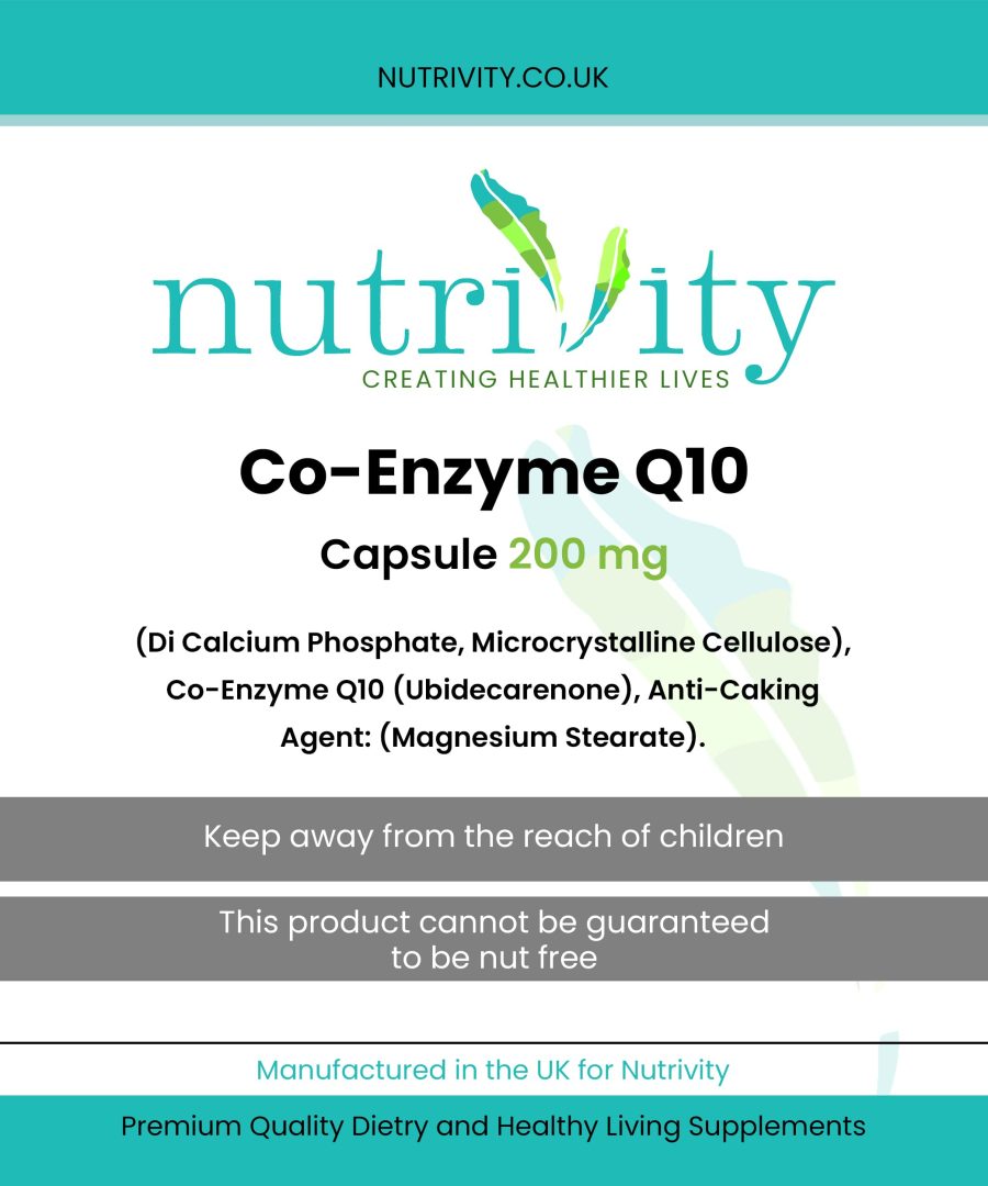 Nutrivity’s Co Enzyme Q10 (CoQ10) offers capsules containing 200mg of naturally fermented and easily absorbed Coenzyme Q-10 or Ubiquinone each.