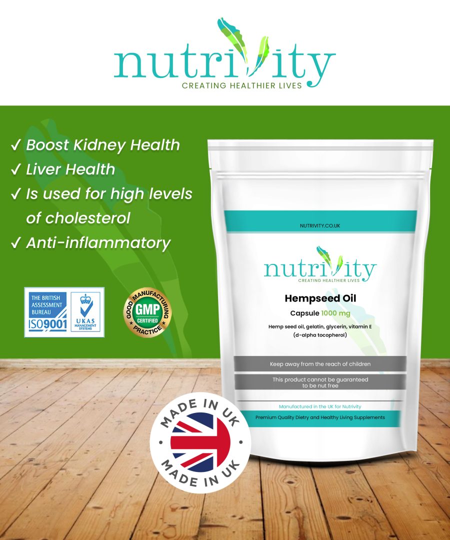 Hemp seed oil has been known for centuries as an excellent source of vital polyunsaturated fatty acids, so important for our health. It provides both omega-3 fatty acids in the form of alpha-linolenic acid (ALA) and omega-6 fatty acids in the form of linoleic acid (LA) and gamma linoleic acid (GLA). These capsules also contain Vitamin E which is widely known as a benefit in skin care and hair care.